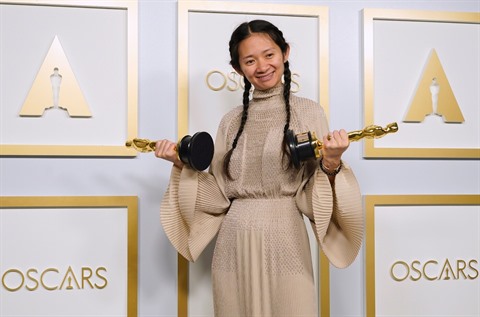 | La réalisatrice et productrice chinoise Chloe Zhao, première cinéaste non blanche à remporter l'Oscar du meilleur réalisateur pour le film Nomadland, le 25 avril à Los Angeles. |