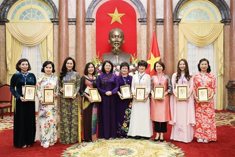 | La vice-présidente de la République, Dang Thi Ngoc Thinh (5e à gauche), rencontre les femmes chefs d'entreprise de Hanoï, le 15 octobre. |
