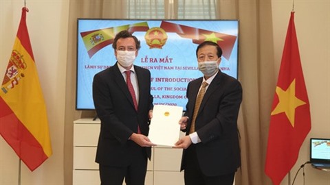 | L'ambassadeur du Vietnam en Espagnol, Hoàng Xuân Hai (droite), et Pablo Rafael Gómez Falcón, consul d’honneur du Vietnam dans la ville de Séville, |