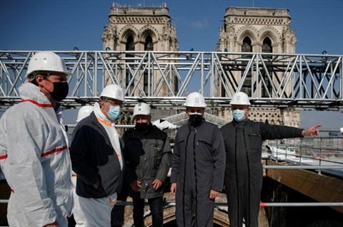 | Emmanuel Macron, Jean-Louis Georgelin et l'archevêque de Paris, Michel Aupetit, visitent le chantier de Notre-Dame de Paris, le 15 avril. |