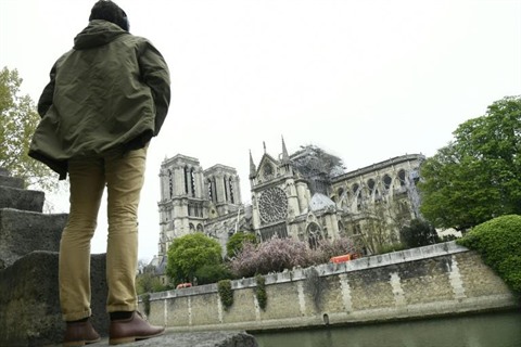 | Un passant observe la cathédrale Notre-Dame de Paris au lendemain de l'incendie qui a notamment provoqué la chute de sa flèche, culminant à 93m, le 16 mars. |