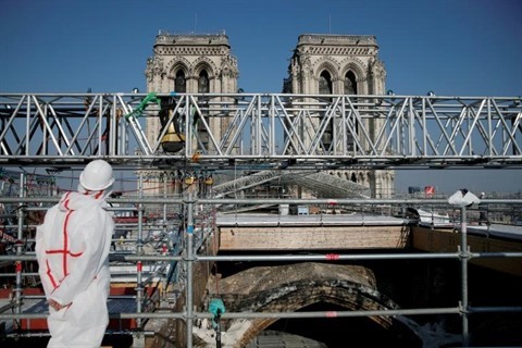 | Des échafaudages sur le toit de Notre-Dame de Paris, le 15 avril. |