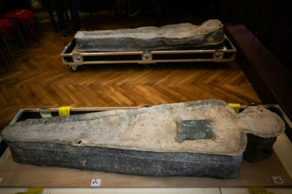| Les deux cercueils de plomb découverts après l'incendie dans la cathédrale Notre-Dame de Paris exposés à Toulouse, le 9 décembre. |