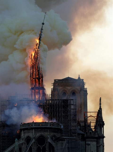 | La flêche de Notre-Dame de Paris, en feu, s'effondre, le 15 avril. |