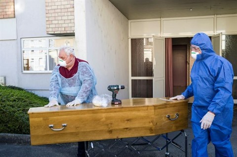 | Des employés d'une société funéraire sont venus chercher le corps d'une personne âgée décédée du COVID-19 dans une maison de retraite de l'Est de la France, à Mulhouse, le 5 avril |