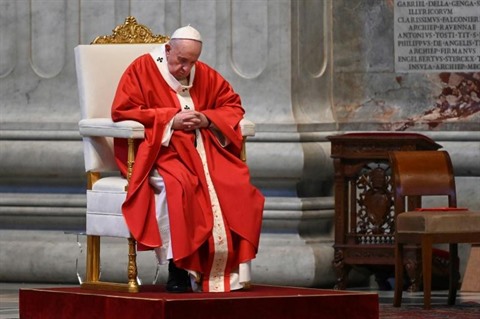 | Le pape François se recueille lors de la messe des Rameaux, le 5 avril à la basilique Saint-Pierre. |