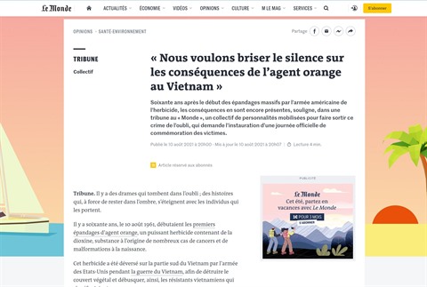 Intitulé Nous voulons briser le silence sur les conséquences de l'agent orange au Vietnam, l'article affirme que 60 ans après le début des épandages massifs par l’armée américaine de l’herbicide, les conséquences en sont encore présentes.