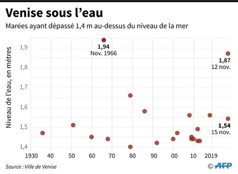 Mardi soir 12 novembre, cette ville avait connu sa pire marée haute en 53 ans, atteignant 1,87 m. Soit le deuxième record historique derrière celui du 4 novembre 1966 (1,94 m). L'eau a envahi les églises, commerces, musées et hôtels de ce joyau classé au patrimoine mondial.