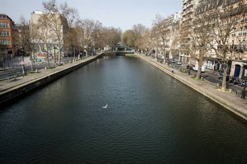 | Le canal de l'Ourcq à Paris, dont les berges sont désertes, le 20 mars. |