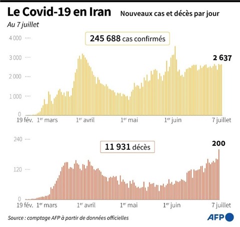 | Évolution du nombre de cas et de morts quotidiens du Covid-19 en Iran, au 7 juillet. |