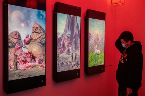 | Un visiteur regarde des œuvres NFT de l'artiste américain Beeple lors d'une exposition intitulée "Niche virtuelle : avez-vous déjà vu des mêmes dans un miroir ?", à Pékin le 26 mars 2021. |