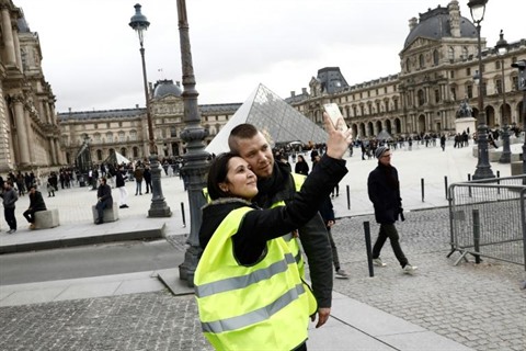 | "Gilets jaunes" devant la pyramide du Louvre, à Paris, le 2 décembre 2018. |