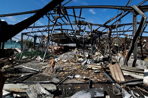 | Une usine détruite après un raid imputé à la coalition saoudienne à Sanaa au Yémen. |