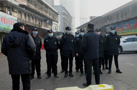 | Des agents de sécurité montent la garde le 12 janvier devant les portes fermées d'un marché de Wuhan, en Chine. |