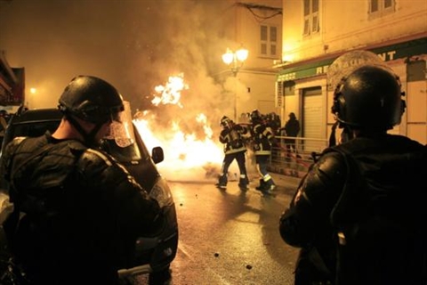 | Des pompiers tentent d'éteindre les flammes, lors d'affrontements entre manifestants et policiers à Corte, en Corse, le 16 février. |