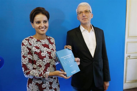 | La ministre de l'Éducation nationale, Najat Vallaud-Belkace, et le président du Conseil supérieur des programmes, Michel Lussault, lors de la présentation le 18 septembre à Paris la version quasi-définitive des programmes scolaires. |