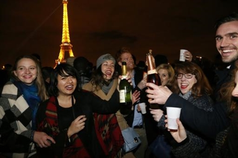 À Paris, toujours sous le choc des attentats du 13 novembre (130 morts, 350 blessés), des milliers de personnes se sont malgré tout pressées sur l'avenue des Champs-Élysées pour des célébrations maintenues mais dans une version allégée, sans le traditionnel feu d'artifice, alors que le risque terroriste reste "très élevé" selon les autorités.