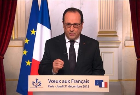 | Capture d'écran de l'allocution télévisée de François Hollande présentant ses vœux pour 2016, le 31 décembre 2015 à l'Élysée à Paris |