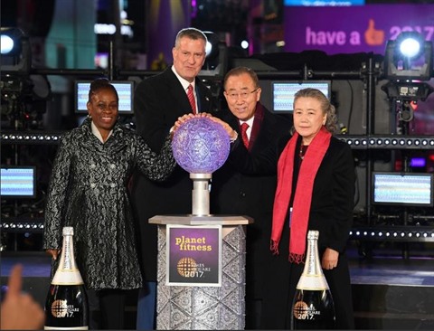 | Le maire de New York, Bill de Blasio (2e, à gauche), le secrétaire général des Nations Unies sortant, Ban Ki-moon (2e, à droite), sur Times Square à New York, pendant les dernières secondes de l'année 2016. |