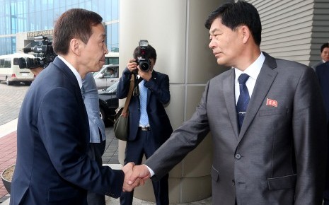 | Le chef de la délégation nord-coréenne Pak Chol-Su (droite) serre la main de son homologue sud-coréen Kim Ki-Woong avant un quatrième tour de négociations sur le site industriel de Kaesong le 17 Juillet. |