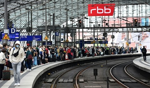 | Des voyageurs attendant un train à Berlin pendant une grève des conducteurs le 23 août. |
