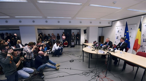 | Conférence de presse du procureur de Paris François Molins (gauche) et du procureur fédéral belge Frédéric van Leeuw, le 21 mars à Bruxelles. |