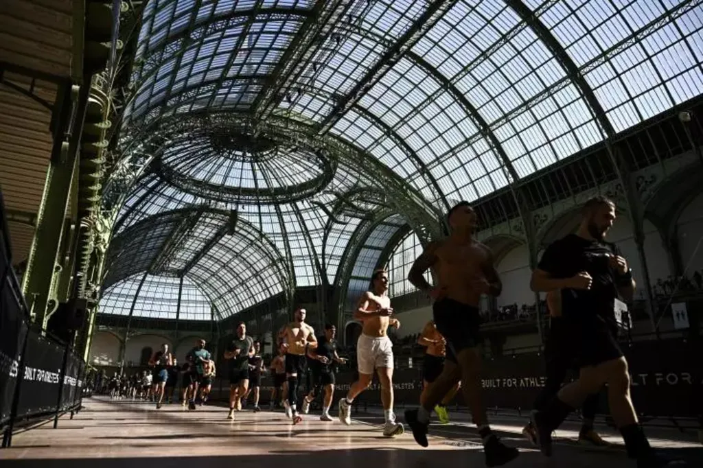 | Des participants du Hyrox fitness courent sous la verrière du Grand Palais à Paris, le 18 avril 2025. |