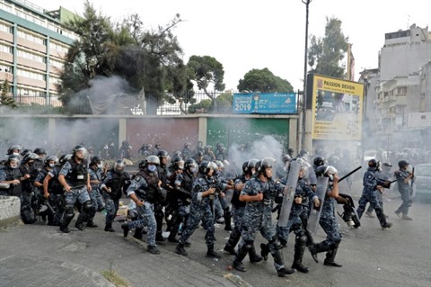| La police anti-émeute à Beyrouth face aux manifestants protestant contre la France, le 30 octobre. |