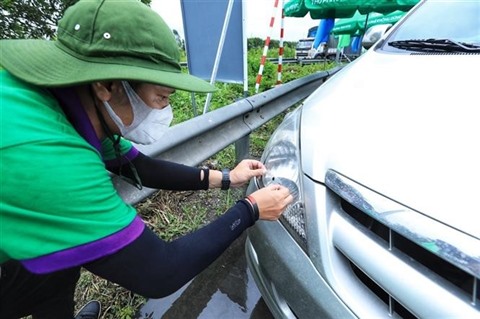 | L'installation de la carte de télépéage prépayée ETC (Electronic Toll Collection) sur une voiture à Ninh Binh (Nord). |