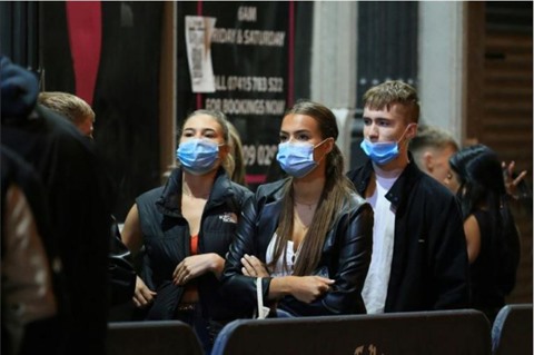 | Des jeunes sortent dans le centre de Liverpool, le 10 octobre 2020, tout dans l'attente de nouvelles restrictions annoncées problablement lundi 12 octobre par le Premier ministre Boris Johnson. |