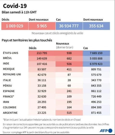 | Bilan mondial de la pandémie de nouveau coronavirus, au 10 octobre à 11h00 GMT. |