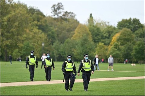 | Des policiers en patrouille à Hyde Park, dans le centre de Londres, le 10 octobre 2020 au Royaume-Uni. |