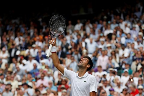 | Le Serbe Novak Djokovic après sa victoire face au Belge David Goffin en quarts de finale du tournoi de Wimbledon le 10 juillet 2019. |