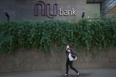 | Une passante devant le siège de la banque en ligne brésilienne Nubank le 9 juin à Sao Paulo. |