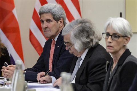 | Le secrétaire d'État américain John Kerry, le secrétaire américain à l'Énergie Ernest Moniz, la secrétaire aux Affaires étrangères Wendy Sherman le 30 mars à Lausanne. |
