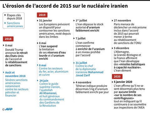 Le 5 janvier, Téhéran avait annoncé la "cinquième et dernière phase" de son plan de réduction de ses engagements, en riposte à la sortie des États-Unis de l'accord en 2018 et au rétablissement de lourdes sanctions américaines qui étranglent son économie.
