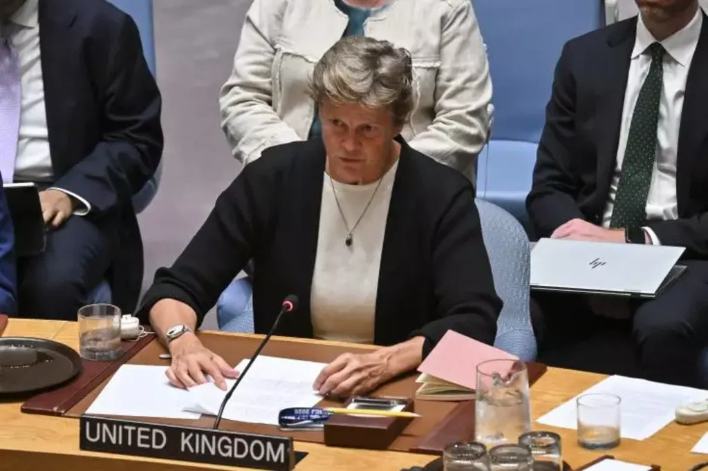 | L'ambassadrice britannique auprès de l'ONU, Barbara Woodward, le 16 juillet 2025 à New York. |