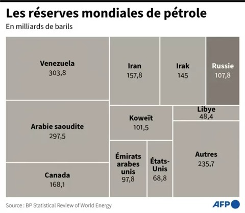 | Répartition des réserves de pétrole, en milliards de barils, entre les dix pays aux réserves les plus vastes d'après le BP Statistical Reserves of World Energy. |