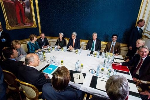 | Réunion des chefs de la diplomatie européenne, américaine, britannique et française au Palais Coburg, lors des négociations sur le nucléaire iranien, le 21 novembre à Vienne. |