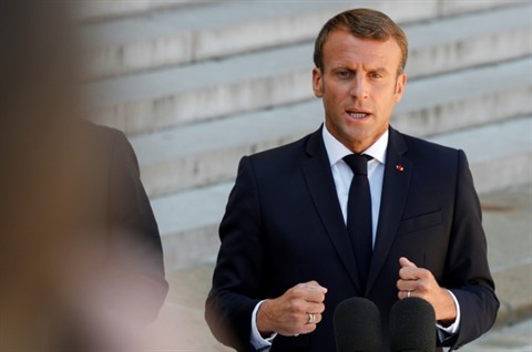 | Le président français Emmanuel Macron s'adresse à la presse devant l'Élysée, le 22 août. |