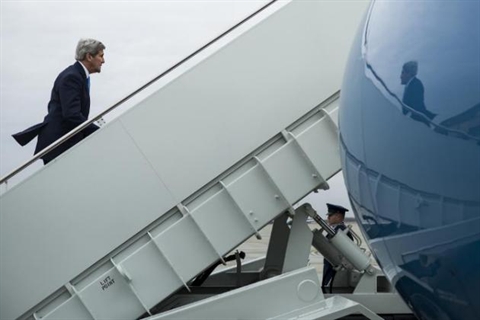 | Le secrétaire d'État américain John Kerry s'apprête depuis la base aérienne de Andrews à embarquer dans un avion à destination de la Suisse, le 25 mars. |