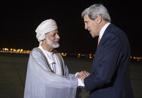 | Le secrétaire d'État américain John Kerry accueilli par le ministre des Affaires étrangères omanais Youssef ben Alaoui à son arrivée à Mascate le 9 novembre 2014. |