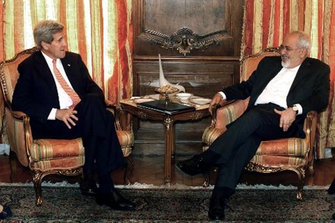 | Le secrétaire d'État américain John Kerry (gauche) et le chef de la diplomatie iranienne Mohammad Javad Zarif aux Nations unies à New York le 27 avril. |