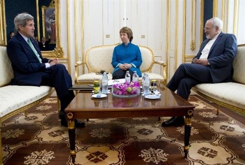 | Le secrétaire d'État américain John Kerry (gauche), la chef de la diplomatie européenne Catherine Ashton et le ministre iranien des Affaires étrangères Mohammad Javad Zarif, lors d'une réunion tripartite |