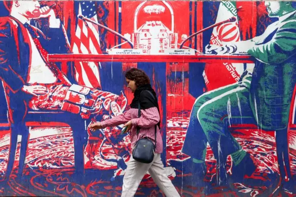 | Une personne passe devant une fresque sur l'ancienne ambassade américaine à Téhéran, le 8 avril 2025. |