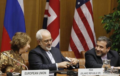 | La chef de la diplomatie européenne Catherine Ashton (gauche), le chef de la diplomatie iranienne Mohammad Javad Zarif (centre) et l'ambassadeur iranien en Autriche, Hassan Tajik, le 14 mai |