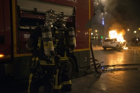 | Des pompiers interviennent sur une voiture de police en feu, place de la République à Paris, le 23 avril. |