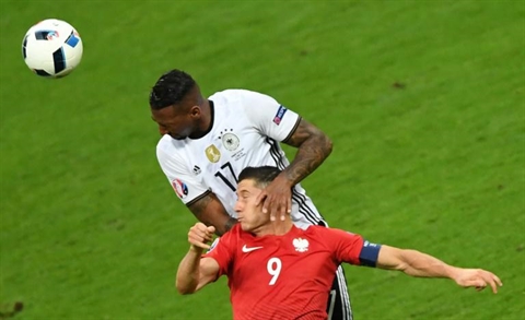 | Le défenseur allemand, Jérôme Boateng, saute plus haut que l'attaquant polonais Robert Lewandowski, lors du match entre leurs deux équipes, à Saint-Denis, le 16 juin. |