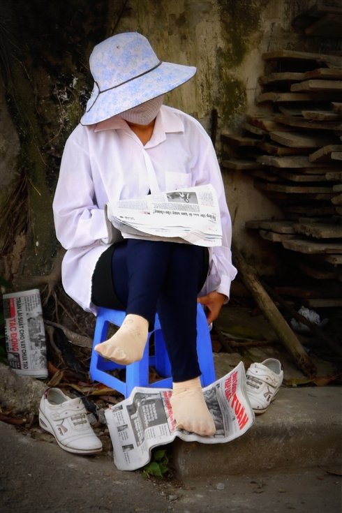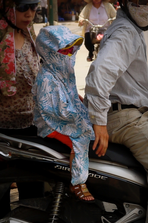 Presque aussi complexe que la burqa, l’attirail anti-soleil vietnamien à la mode vietnamienne est conséquent. Un blouson informe, toujours le même décliné en une dizaine de motifs fleuris différents, permet de couvrir tout le haut du corps, du dessus des mains jusqu’au sommet du crâne. Les plus élaborés ont une casquette intégrée. Aucune parcelle de peau n’est laissée à l’infâme astre brûlant, le nez et la bouche sont couverts par un cache-nez complété de lunettes de soleil et au choix, une casquette ou un chapeau à bords larges, coincés sous la capuche. Une forme de jupe couverture, parfois assortie au blouson, recouvre les jambes des conductrices de scooters. Ajoutez à cela des gants et des chaussettes pour les plus radicales, des bas couleur chair pour les ultra et le tout donne ces masses biscornues et multicolores qui se meuvent au pas de course ou à scooter. Cocasse... L’ombrelle, au charme infini, se fait, quant à elle, de plus en plus rare et n’arrive qu’en complément de cet équipement.