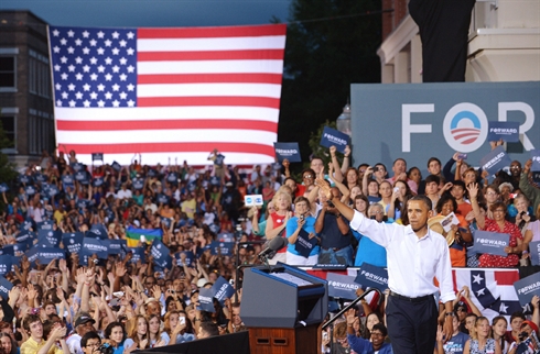 | Barack Obama (chemise blanche) lors d’une rencontre avec ses supporteurs le 13 juillet à Roanoke en Virginie. |
